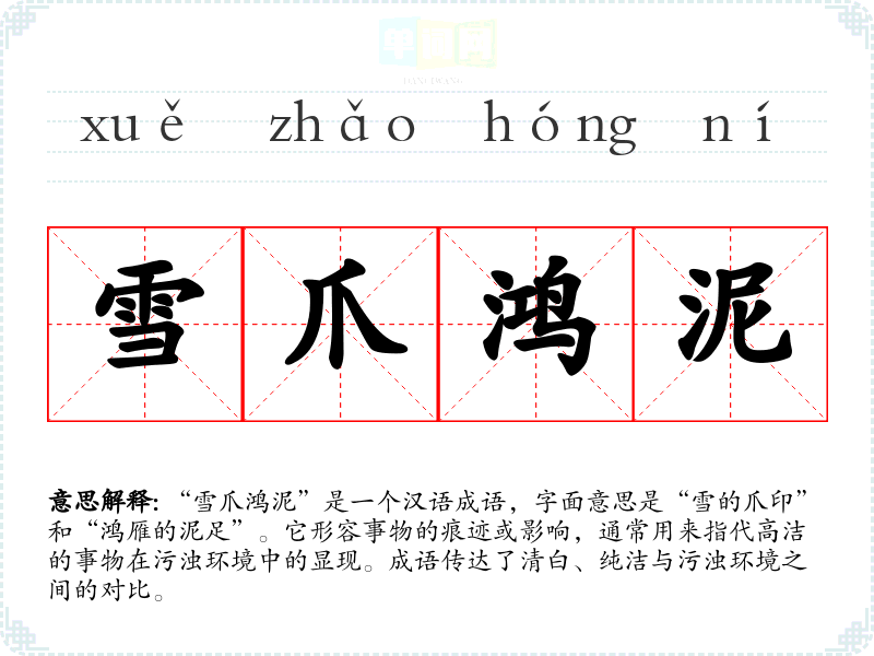 “雪爪鸿泥”是一个汉语成语,字面意思是“雪的爪印”和“鸿雁的泥足”。它形容事物的痕迹或影响,通常用来指代高洁的事物在污浊环境中的显现。成语传达了清白、纯洁与污浊环境之间的对比。
