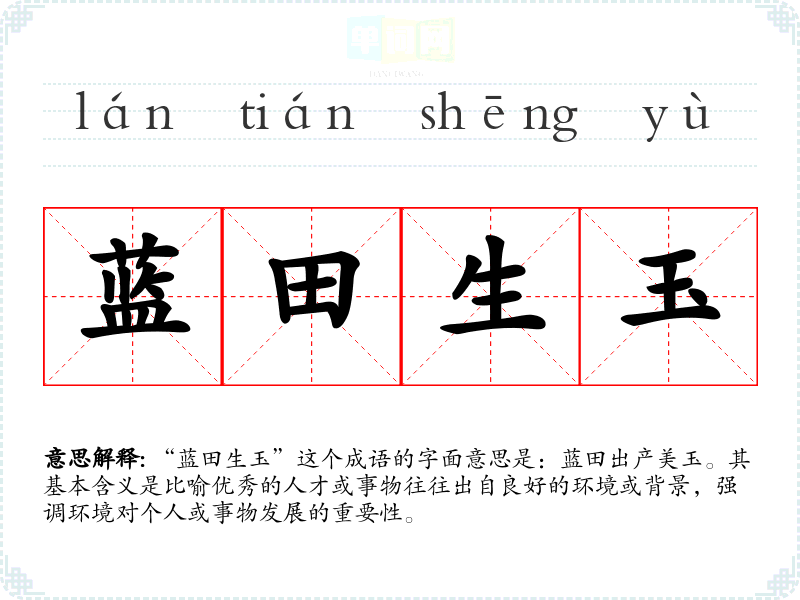 “蓝田生玉”这个成语的字面意思是:蓝田出产美玉。其基本含义是比喻优秀的人才或事物往往出自良好的环境或背景,强调环境对个人或事物发展的重要性。