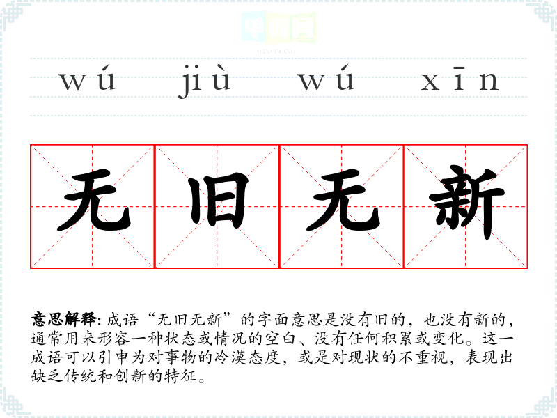 成语“无旧无新”的字面意思是没有旧的,也没有新的,通常用来形容一种状态或情况的空白、没有任何积累或变化。这一成语可以引申为对事物的冷漠态度,或是对现状的不重视,表现出缺乏传统和创新的特征。