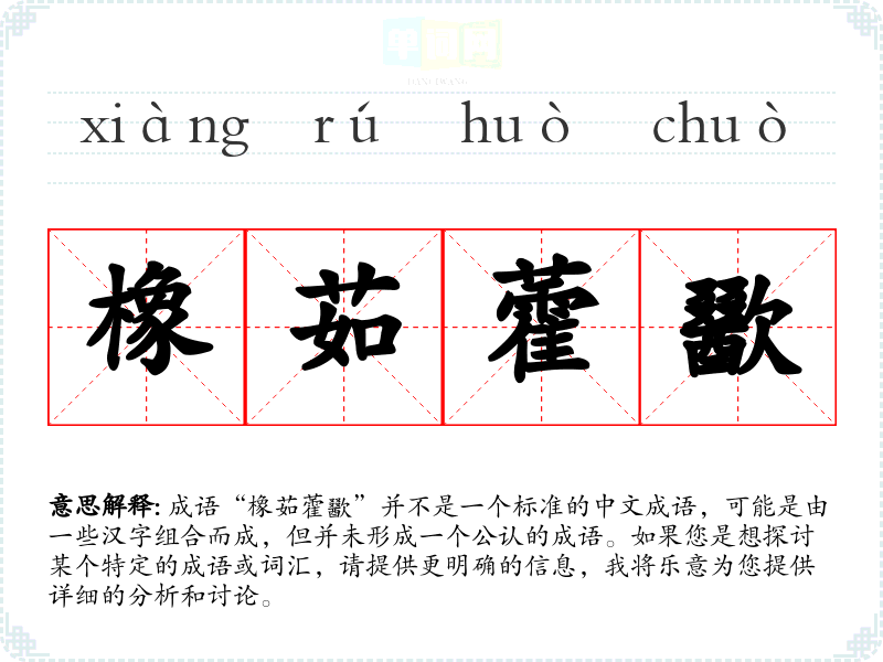 成语“橡茹藿歠”并不是一个标准的中文成语,可能是由一些汉字组合而成,但并未形成一个公认的成语。如果您是想探讨某个特定的成语或词汇,请提供更明确的信息,我将乐意为您提供详细的分析和讨论。