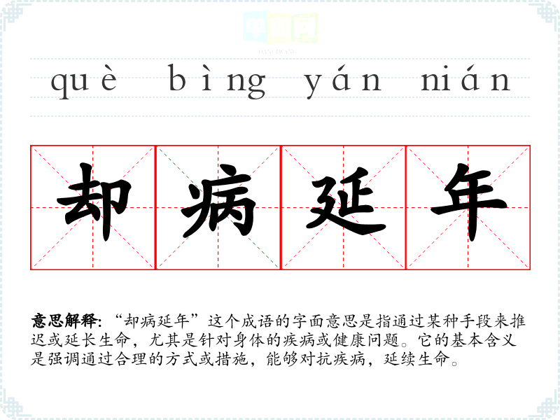 “却病延年”这个成语的字面意思是指通过某种手段来推迟或延长生命,尤其是针对身体的疾病或健康问题。它的基本含义是强调通过合理的方式或措施,能够对抗疾病,延续生命。