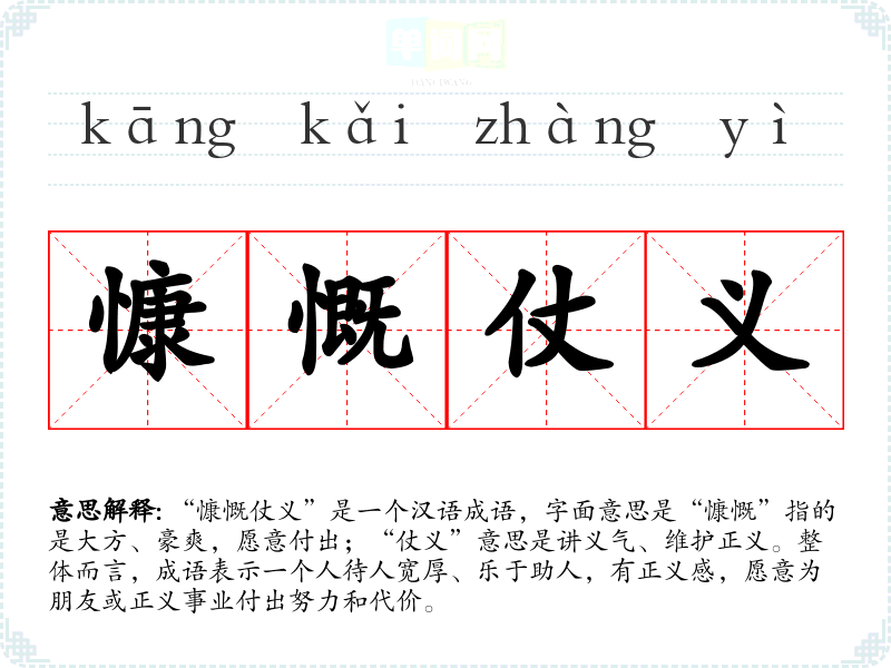“慷慨仗义”是一个汉语成语,字面意思是“慷慨”指的是大方、豪爽,愿意付出;“仗义”意思是讲义气、维护正义。整体而言,成语表示一个人待人宽厚、乐于助人,有正义感,愿意为朋友或正义事业付出努力和代价。