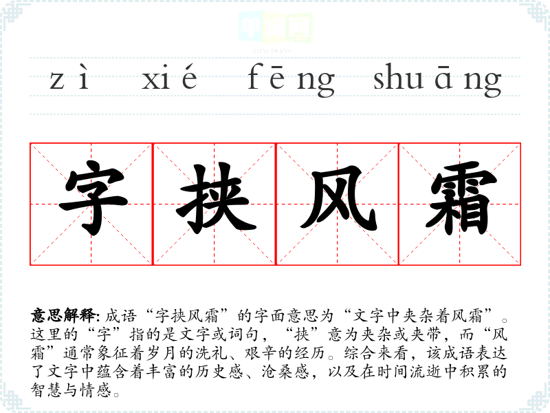 该成语的具体来源不详,但可以推测与古代文人对文字的理解和使用有关。古时文人往往在作品中融入个人经历与感悟,常常在字里行间流露出对时光、生活的感慨。因此,“字挟风霜”可被视为对这种文化现象的总结,强调文字的深沉内涵和作者的情感历程。