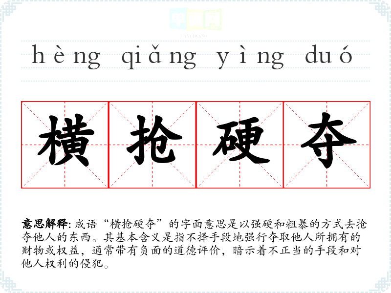 成语“横抢硬夺”的字面意思是以强硬和粗暴的方式去抢夺他人的东西。其基本含义是指不择手段地强行夺取他人所拥有的财物或权益,通常带有负面的道德评价,暗示着不正当的手段和对他人权利的侵犯。
