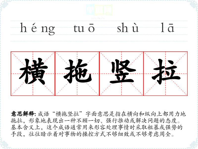 成语“横拖竖拉”字面意思是指在横向和纵向上都用力地拖拉,形象地表现出一种不顾一切、强行推动或解决问题的态度。基本含义上,这个成语通常用来形容处理事情时采取粗暴或强势的手段,往往暗示着对事物的操控方式不够细致或不够考虑周全。