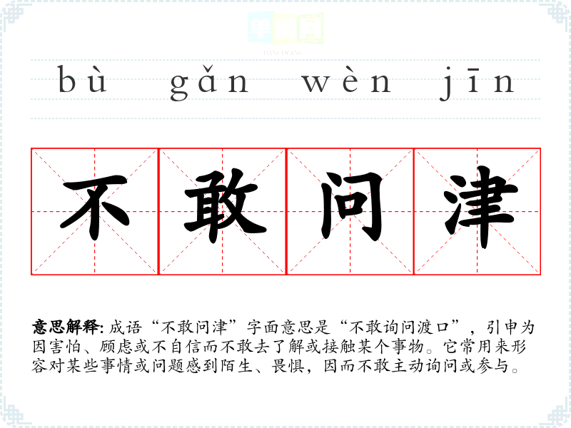 成语“不敢问津”字面意思是“不敢询问渡口”,引申为因害怕、顾虑或不自信而不敢去了解或接触某个事物。它常用来形容对某些事情或问题感到陌生、畏惧,因而不敢主动询问或参与。