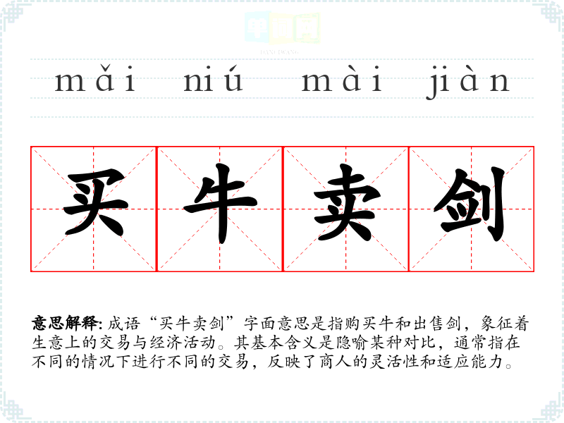 成语“买牛卖剑”字面意思是指购买牛和出售剑,象征着生意上的交易与经济活动。其基本含义是隐喻某种对比,通常指在不同的情况下进行不同的交易,反映了商人的灵活性和适应能力。
