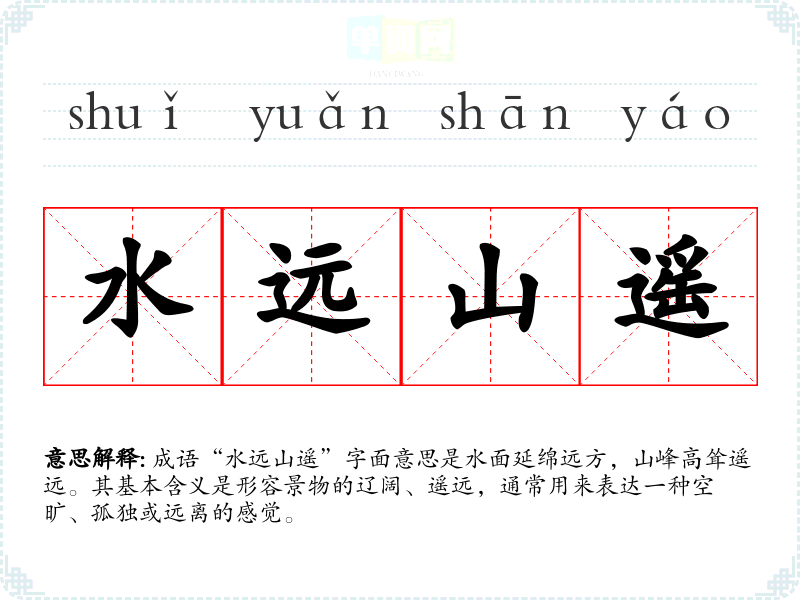 成语“水远山遥”字面意思是水面延绵远方,山峰高耸遥远。其基本含义是形容景物的辽阔、遥远,通常用来表达一种空旷、孤独或远离的感觉。