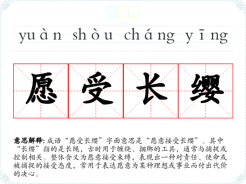 成语“愿受长缨”字面意思是“愿意接受长缨”。其中“长缨”指的是长绳,古时用于缠绕、捆绑的工具,通常与捕捉或控制相关。整体含义为愿意接受束缚,表现出一种对责任、使命或被捕捉的接受态度,常用于表达愿意为某种理想或事业而付出代价的决心。