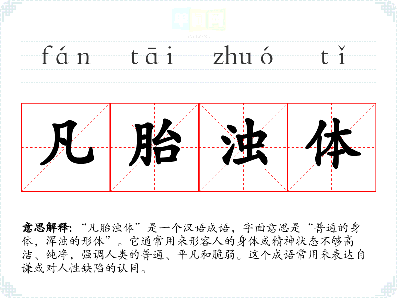 | 凡胎浊体 | 指人间普通的,平庸的人。同“凡胎浊骨”。 |