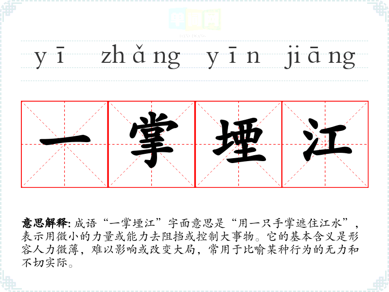 成语“一掌堙江”字面意思是“用一只手掌遮住江水”,表示用微小的力量或能力去阻挡或控制大事物。它的基本含义是形容人力微*,难以影响或改变大局,常用于比喻某种行为的无力和不切实际。
