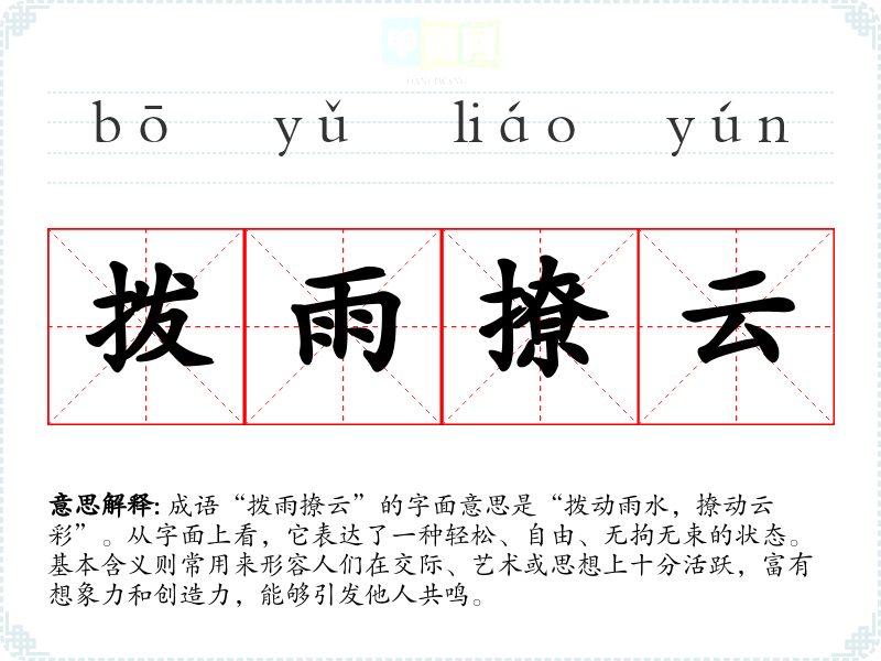 成语“拨雨撩云”的字面意思是“拨动雨水,撩动云彩”。从字面上看,它表达了一种轻松、自由、无拘无束的状态。基本含义则常用来形容人们在交际、艺术或思想上十分活跃,富有想象力和创造力,能够引发他人共鸣。