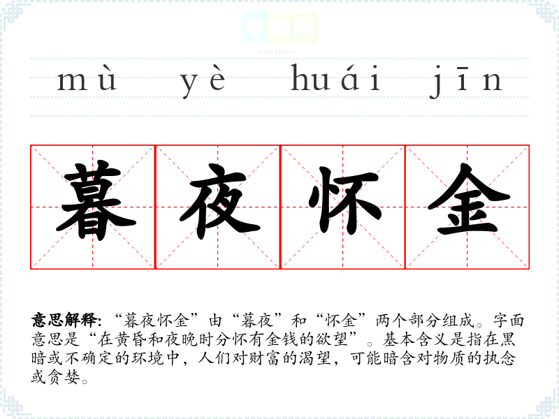 “暮夜怀金”由“暮夜”和“怀金”两个部分组成。字面意思是“在黄昏和夜晚时分怀有金钱的欲望”。基本含义是指在黑暗或不确定的环境中,人们对财富的渴望,可能暗含对物质的执念或贪婪。