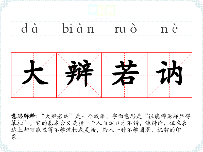 “大辩若讷”是一个成语,字面意思是“很能辩论却显得笨拙”。它的基本含义是指一个人虽然口才不错,能辩论,但在表达上却可能显得不够流畅或灵活,给人一种不够圆滑、机智的印象。