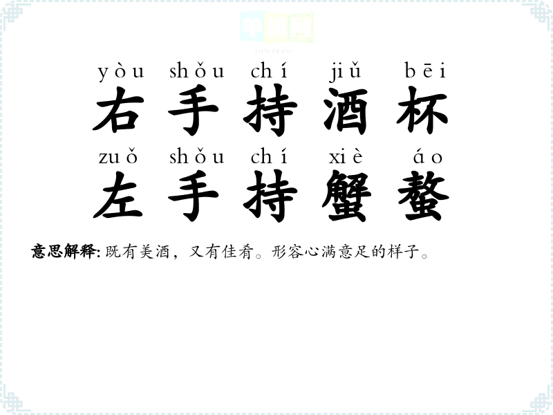 | 右手持酒杯,左手持蟹螯 | 既有美酒,又有佳肴。形容心满意足的样子。 |