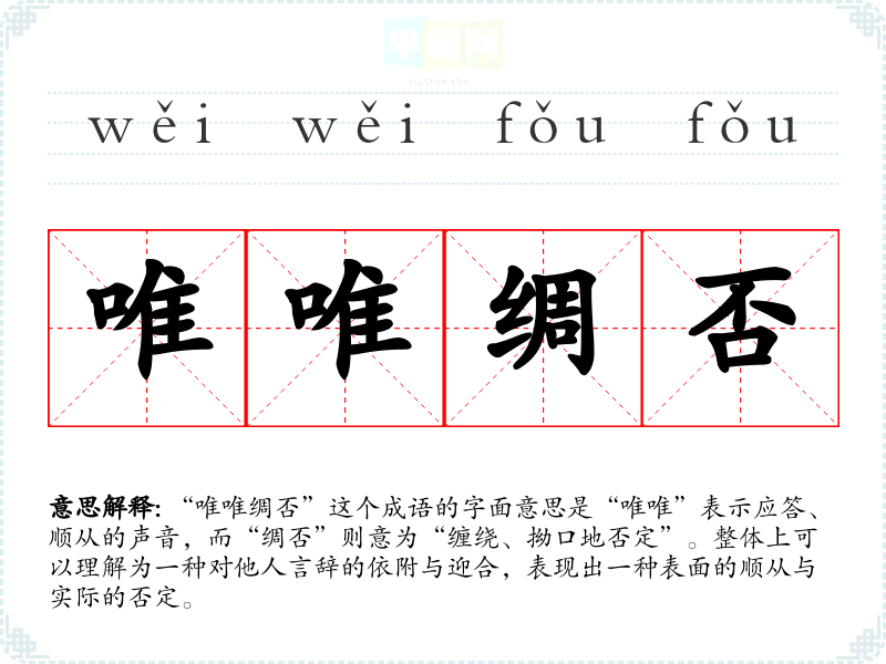 “唯唯绸否”这个成语的字面意思是“唯唯”表示应答、顺从的声音,而“绸否”则意为“缠绕、拗口地否定”。整体上可以理解为一种对他人言辞的依附与迎合,表现出一种表面的顺从与实际的否定。
