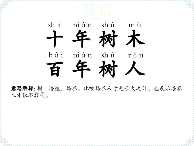 | 一年之计在于春 | 要在一年(或一天)开始时多做并做好工作,为全年(或全天)的工作打好基础。 |