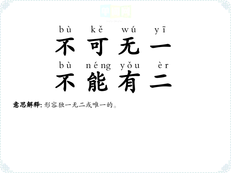 | 不可无一,不能有二 | 形容独一无二或唯一的。 |
