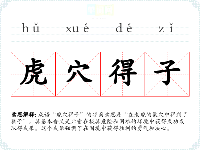 通过对“虎穴得子”的学*,我认识到在生活中面对困难时,勇气和决心是取得成功的重要因素。这个成语不仅丰富了我的语言表达,也为我提供了面对挑战的动力,提醒我在逆境中保持积极的态度。