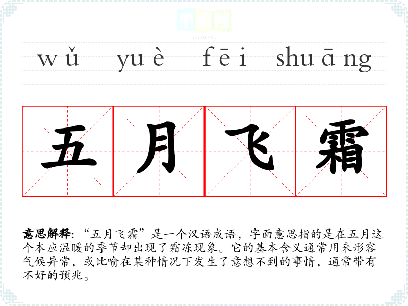 “五月飞霜”是一个汉语成语,字面意思指的是在五月这个本应温暖的季节却出现了霜冻现象。它的基本含义通常用来形容气候异常,或比喻在某种情况下发生了意想不到的事情,通常带有不好的预兆。