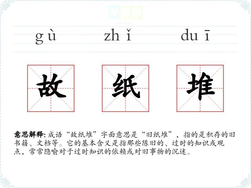 成语“故纸堆”字面意思是“旧纸堆”,指的是积存的旧书籍、文档等。它的基本含义是指那些陈旧的、过时的知识或观点,常常隐喻对于过时知识的依赖或对旧事物的沉迷。