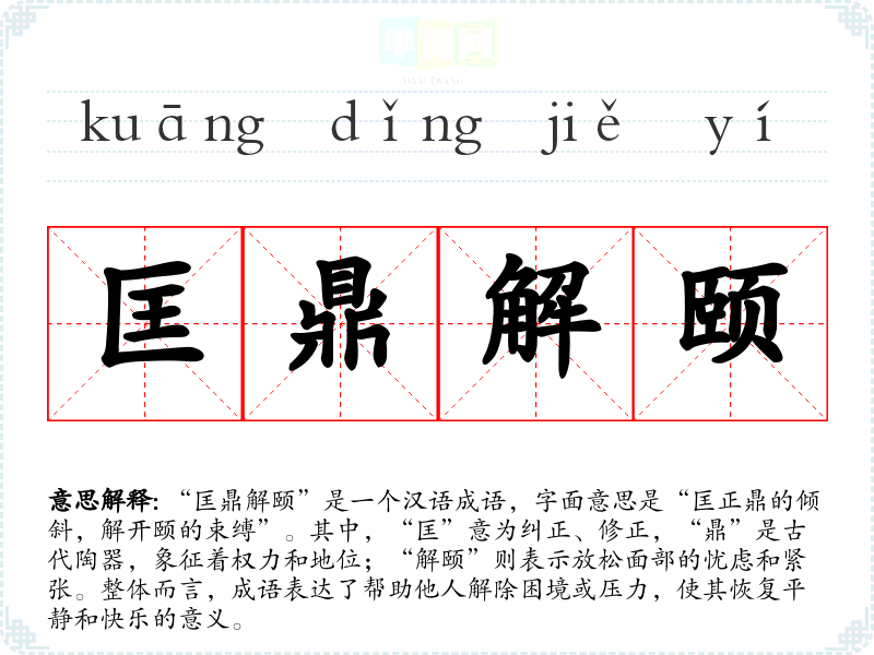 “匡鼎解颐”出自《左传》,原文为“匡正鼎革,解颐于内”。这句话的背景是春秋时期,表述了对国家和人民的关爱与责任。它反映了古人对治理和关怀的重视,强调了领导者应有的责任感。
