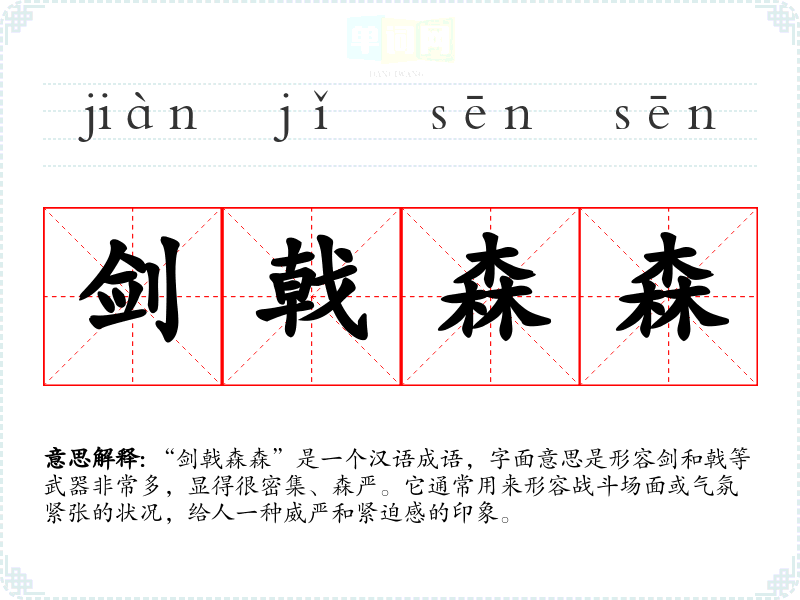 “剑戟森森”是一个汉语成语,字面意思是形容剑和戟等武器非常多,显得很密集、森严。它通常用来形容战斗场面或气氛紧张的状况,给人一种威严和紧迫感的印象。