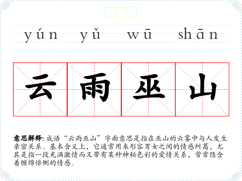 成语“云雨巫山”字面意思是指在巫山的云雾中与人发生亲密关系。基本含义上,它通常用来形容男女之间的情感纠葛,尤其是指一段充满激情而又带有某种神秘色彩的爱情关系,常常隐含着缠绵悱恻的情感。