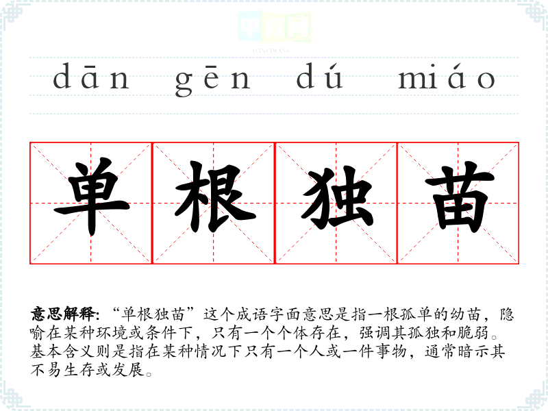 “单根独苗”这个成语字面意思是指一根孤单的幼苗,隐喻在某种环境或条件下,只有一个个体存在,强调其孤独和脆弱。基本含义则是指在某种情况下只有一个人或一件事物,通常暗示其不易生存或发展。