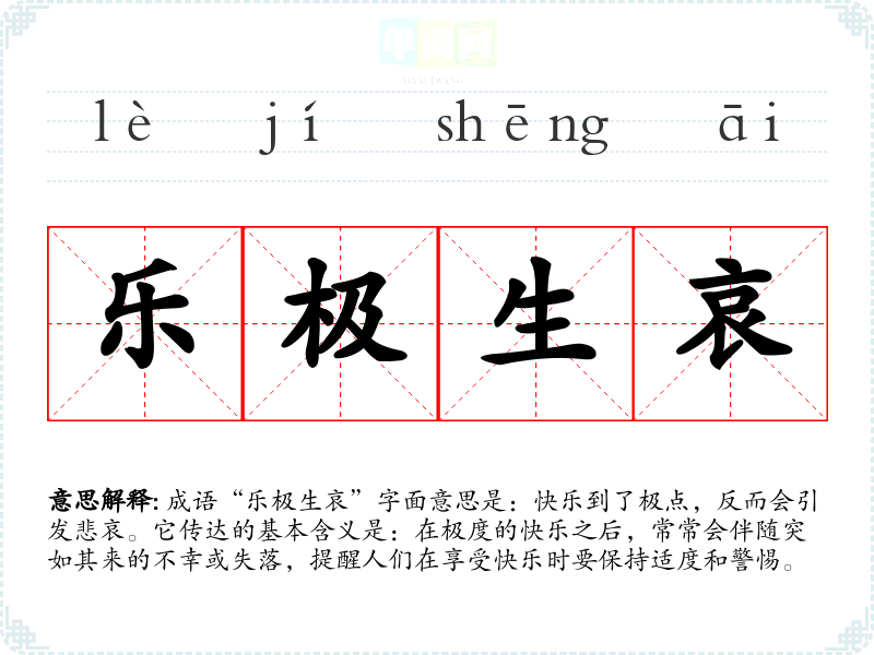 成语“乐极生哀”字面意思是:快乐到了极点,反而会引发悲哀。它传达的基本含义是:在极度的快乐之后,常常会伴随突如其来的不幸或失落,提醒人们在享受快乐时要保持适度和警惕。