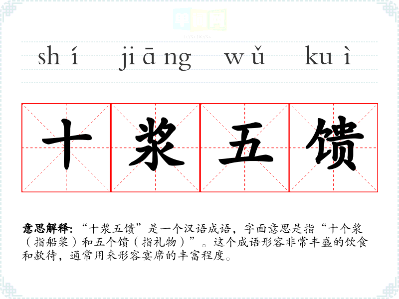 “十浆五馈”是一个汉语成语,字面意思是指“十个浆(指船桨)和五个馈(指礼物)”。这个成语形容非常丰盛的饮食和款待,通常用来形容宴席的丰富程度。