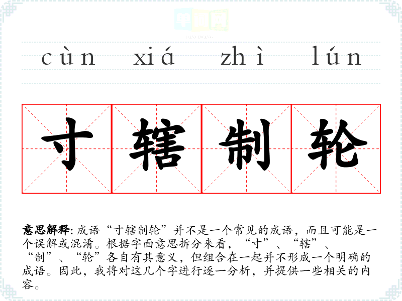 成语“寸辖制轮”并不是一个常见的成语,而且可能是一个误解或混淆。根据字面意思拆分来看,“寸”、“辖”、“制”、“轮”各自有其意义,但组合在一起并不形成一个明确的成语。因此,我将对这几个字进行逐一分析,并提供一些相关的内容。
