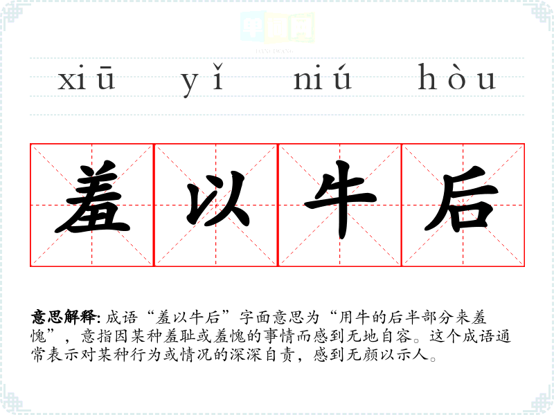成语“羞以牛后”字面意思为“用牛的后半部分来羞愧”,意指因某种羞耻或羞愧的事情而感到无地自容。这个成语通常表示对某种行为或情况的深深自责,感到无颜以示人。