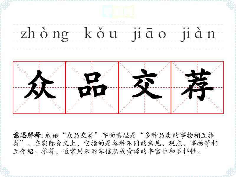 “众品交荐”并没有特别明确的历史典故,可能是由汉语中常见的“众”和“推荐”两个词组合而成,体现了多样性和交流的概念。虽然没有明确的出处,但它符合汉字文化中对“众”的重视和对多样性交流的崇尚。
