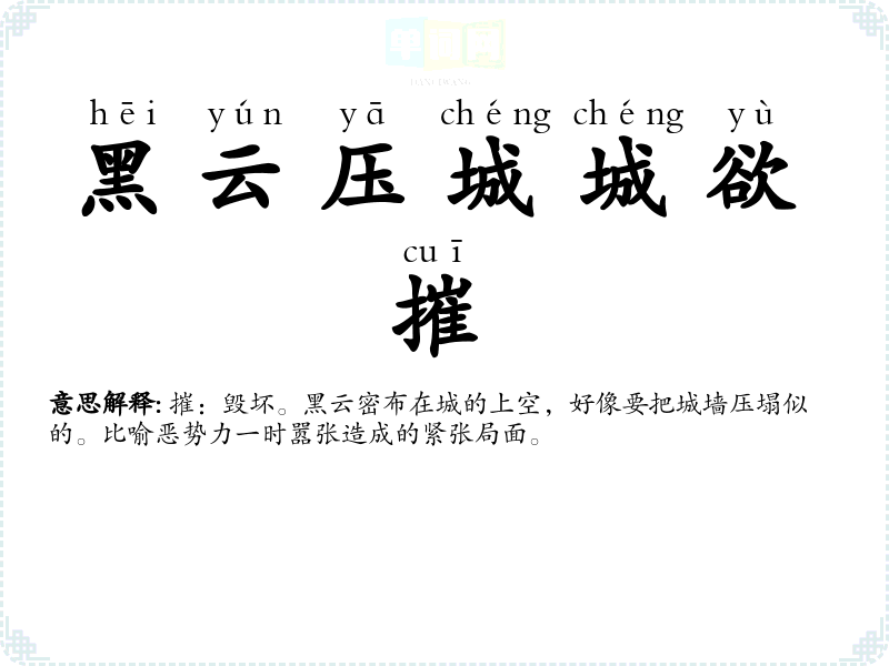 | 黑云压城城欲摧 | 摧:毁坏。黑云密布在城的上空,好像要把城墙压塌似的。比喻恶势力一时嚣张造成的紧张局面。 |