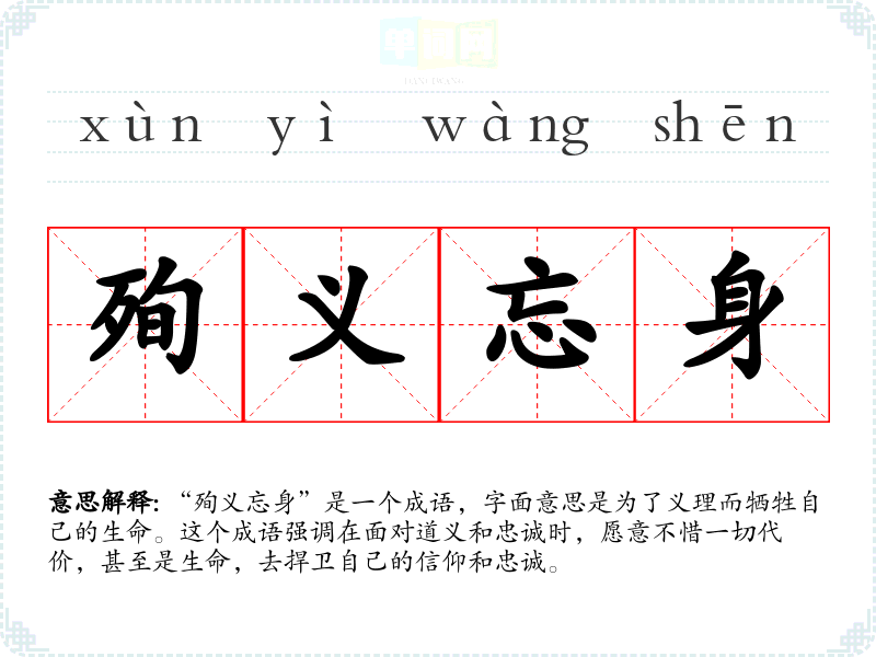 “殉义忘身”是一个成语,字面意思是为了义理而牺牲自己的生命。这个成语强调在面对道义和忠诚时,愿意不惜一切代价,甚至是生命,去捍卫自己的信仰和忠诚。