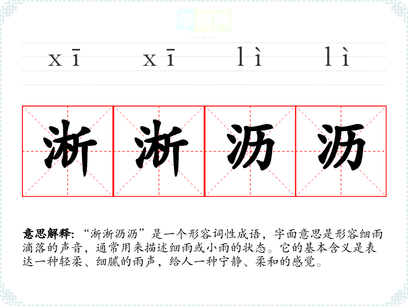 “淅淅沥沥”是一个形容词性成语,字面意思是形容细雨滴落的声音,通常用来描述细雨或小雨的状态。它的基本含义是表达一种轻柔、细腻的雨声,给人一种宁静、柔和的感觉。