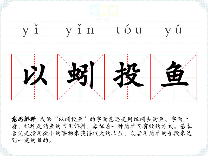 成语“以蚓投鱼”的字面意思是用蚯蚓去钓鱼。字面上看,蚯蚓是钓鱼的常用饵料,象征着一种简单而有效的方式。基本含义是指用微小的事物来获得较大的收益,或者用简单的手段来达到一定的目的。