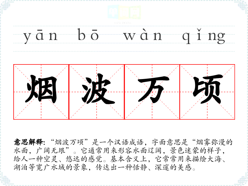 | 万顷烟波 | 形容广阔的水面雾气弥漫,碧波荡漾的景色。 |