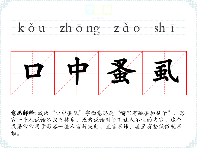 成语“口中蚤虱”字面意思是“嘴里有跳蚤和虱子”,形容一个人说话不拐弯抹角,或者说话时带有让人不快的内容。这个成语常常用于形容一些人言辞尖刻、直言不讳,甚至有些低俗或不雅。