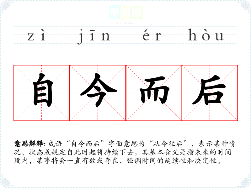 成语“自今而后”字面意思为“从今往后”,表示某种情况、状态或规定自此时起将持续下去。其基本含义是指未来的时间段内,某事将会一直有效或存在,强调时间的延续性和决定性。