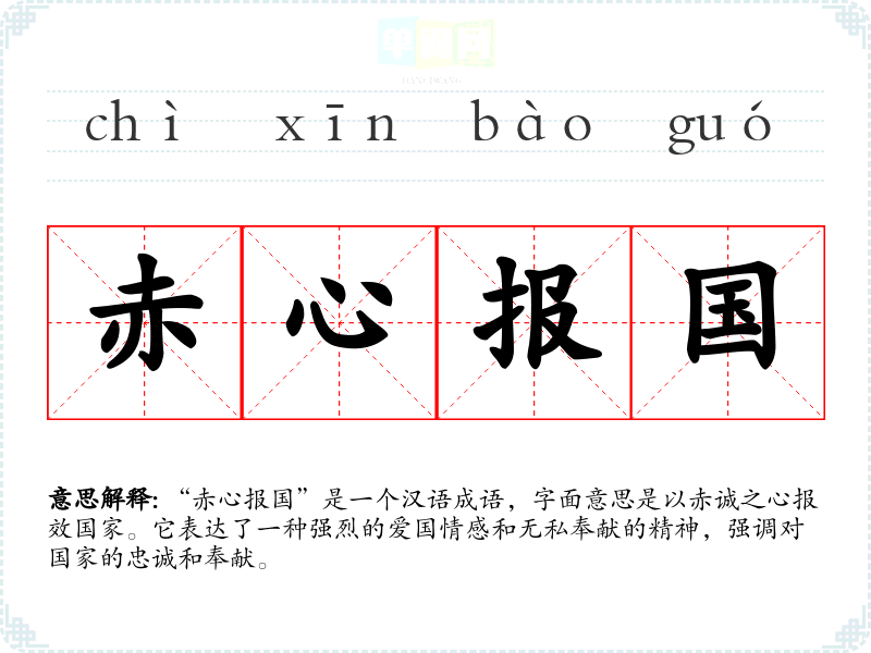 “赤心报国”是一个汉语成语,字面意思是以赤诚之心报效国家。它表达了一种强烈的爱国情感和无私奉献的精神,强调对国家的忠诚和奉献。