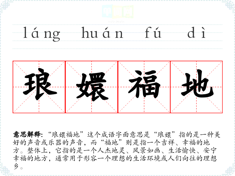“琅嬛福地”这个成语字面意思是“琅嬛”指的是一种美好的声音或乐器的声音,而“福地”则是指一个吉祥、幸福的地方。整体上,它指的是一个人杰地灵、风景如画、生活愉快、安宁幸福的地方,通常用于形容一个理想的生活环境或人们向往的理想乡。