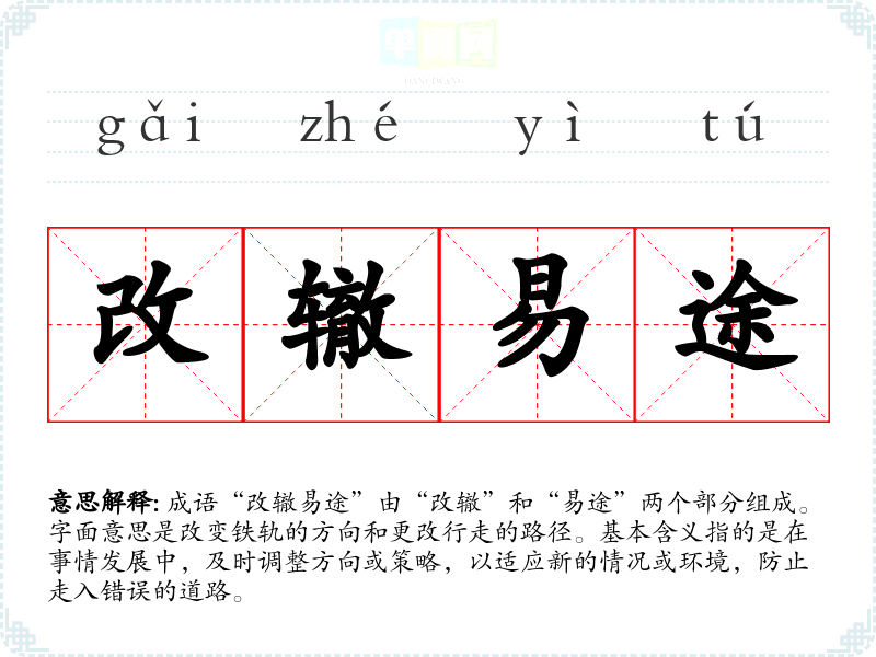 成语“改辙易途”由“改辙”和“易途”两个部分组成。字面意思是改变铁轨的方向和更改行走的路径。基本含义指的是在事情发展中,及时调整方向或策略,以适应新的情况或环境,防止走入错误的道路。