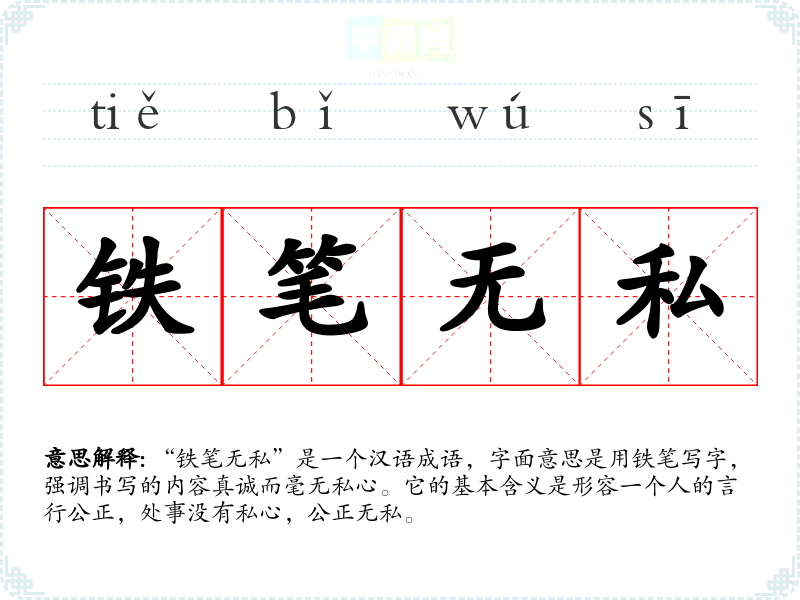 “铁笔无私”是一个汉语成语,字面意思是用铁笔写字,强调书写的内容真诚而毫无私心。它的基本含义是形容一个人的言行公正,处事没有私心,公正无私。