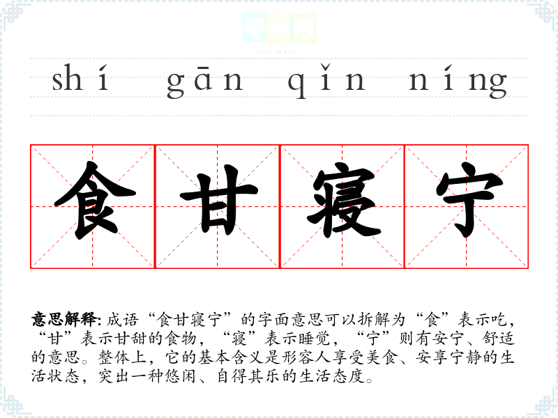 成语“食甘寝宁”的字面意思可以拆解为“食”表示吃,“甘”表示甘甜的食物,“寝”表示睡觉,“宁”则有安宁、舒适的意思。整体上,它的基本含义是形容人享受美食、安享宁静的生活状态,突出一种悠闲、自得其乐的生活态度。