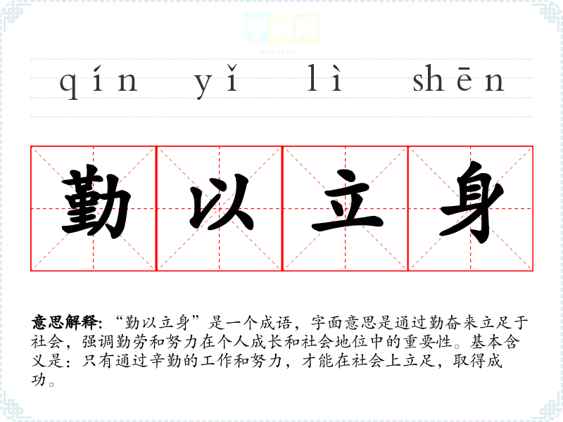 “勤以立身”是一个成语,字面意思是通过勤奋来立足于社会,强调勤劳和努力在个人成长和社会地位中的重要性。基本含义是:只有通过辛勤的工作和努力,才能在社会上立足,取得成功。