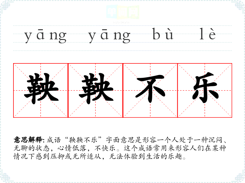成语“鞅鞅不乐”字面意思是形容一个人处于一种沉闷、无聊的状态,心情低落,不快乐。这个成语常用来形容人们在某种情况下感到压抑或无所适从,无法体验到生活的乐趣。