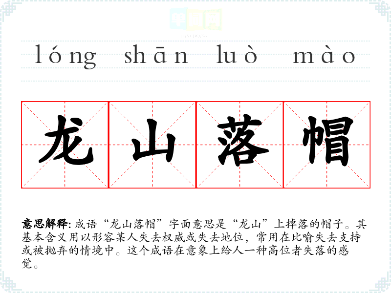 成语“龙山落帽”字面意思是“龙山”上掉落的帽子。其基本含义用以形容某人失去权威或失去地位,常用在比喻失去支持或被抛弃的情境中。这个成语在意象上给人一种高位者失落的感觉。