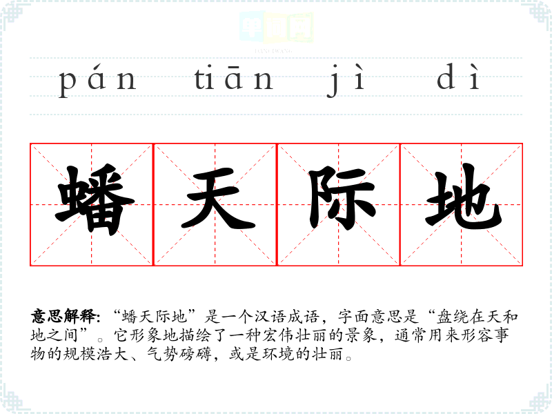 “蟠天际地”给人的第一印象是壮丽和雄伟,常常会引发对大自然的敬畏和对生命的思考。在使用时,能够传达出一种积极向上的情感,激励人们追求宏伟的理想。